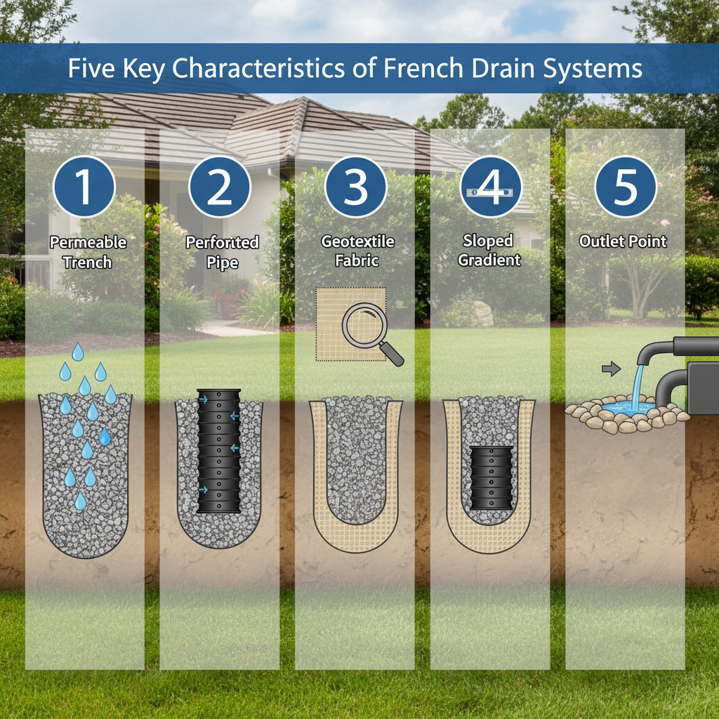 Excess water removal protects your property investment. According to the EPA stormwater management guidelines, improper drainage causes foundation settling, basement water problems, soil erosion, and landscape damage. A French drain provides underground drainage that intercepts groundwater before it reaches vulnerable areas. The system works as a subsurface drainage channel, collecting water through permeable aggregate and transporting it to a safe discharge location via gravity-based drainage.
