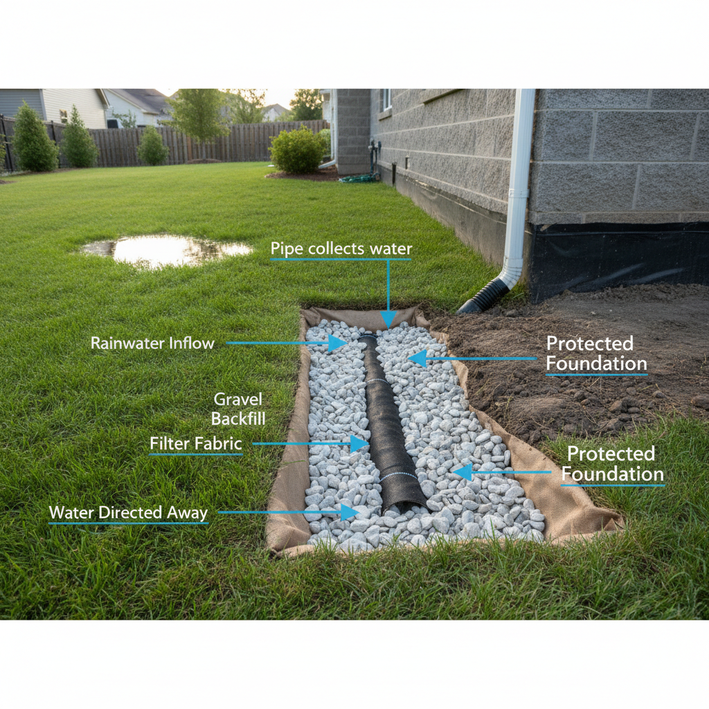 - Wet Yard Solutions: Interceptor drains installed upslope collect water before saturating lawn areas